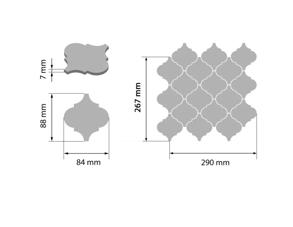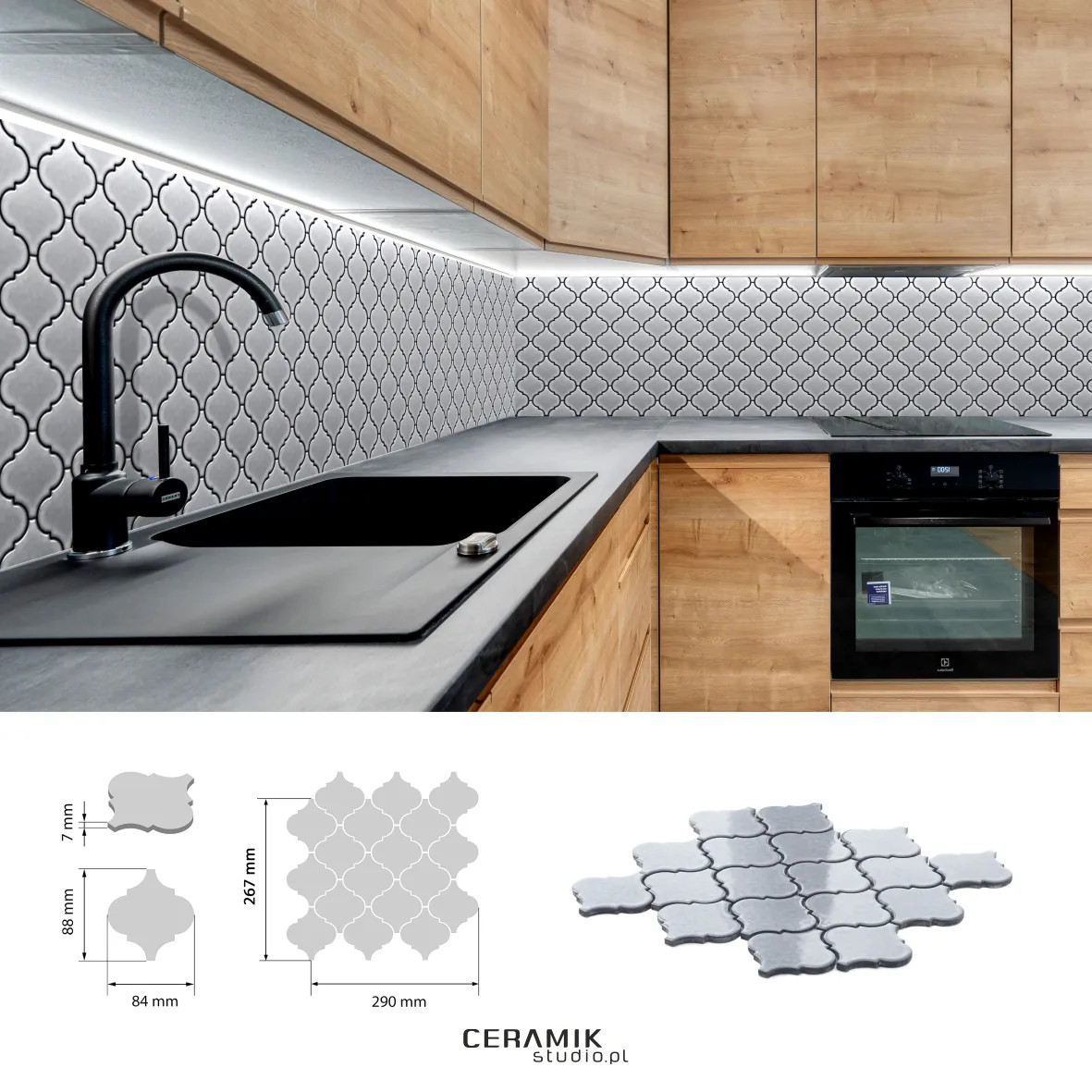gatunek: Gat.1 Mozaika Arabesque Metalic Black Charakterystyka produktu Mozaika Arabesque Metalic Black to ceramiczna mozaika w kształcie arabeski w głębokim, metalicznym odcieniu czerni. Posiada połyskujące wykończenie, które dodaje elegancji i subtelnej głębi kolorystycznej. Każda kostka ma wymiary około 88 × 84 mm, a plastry mozaiki 267 × 290 mm. Grubość płytki wynosi 7 mm, a produkt należy do pierwszego gatunku. Zastosowanie Mozaika Arabesque Metalic Black jest przeznaczona na ściany. Doskonale sprawdzi się w łazienkach, kuchniach, kabinach prysznicowych oraz jako dekoracyjny akcent w salonach, holach i strefach dekoracyjnych wnętrz. Dzięki odporności na wilgoć i łatwości w utrzymaniu czystości, jest praktyczna i estetyczna. Zalety i właściwości Połyskujące wykończenie – elegancki wygląd i łatwe czyszczenie. Kostki na elastycznej siatce montażowej – szybki i wygodny montaż. Odporność na wilgoć i temperaturę – idealna do wilgotnych pomieszczeń. Możliwość docinania płytek – elastyczność w aranżacji. Odporność na ogień – klasa A1. Stylowy, metaliczny design – nadaje wnętrzu nowoczesny i elegancki charakter. Montaż i pielęgnacja Podłoże powinno być równe, suche i oczyszczone. Użyj białego, elastycznego kleju do płytek ceramicznych. Arkusze mozaiki delikatnie dociśnij do podłoża. Zachowaj równą odległość między kostkami przy użyciu krzyżyków dystansowych. Fugowanie wykonaj po co najmniej 24 godzinach od montażu. W wilgotnych pomieszczeniach zaleca się stosowanie fug epoksydowych. Połączenia mozaiki z innymi powierzchniami, np. narożniki, zabezpiecz silikonem. Do czyszczenia używaj łagodnych detergentów i miękkiej ściereczki. Estetyka i styl Czarny kolor z metalicznym połyskiem nadaje mozaice nowoczesny, elegancki charakter. Geometryczny kształt arabeski w połączeniu z refleksami świetlnymi sprawia, że mozaika może być zarówno minimalistycznym akcentem, jak i głównym elementem dekoracyjnym ściany. Podsumowanie Mozaika Arabesque Metalic Black łączy elegancję i wytrzymałość. Dzięki odporności na wilgoć, łatwości montażu i stylowemu designowi jest doskonałym wyborem do wnętrz wymagających trwałego i efektownego wykończenia.