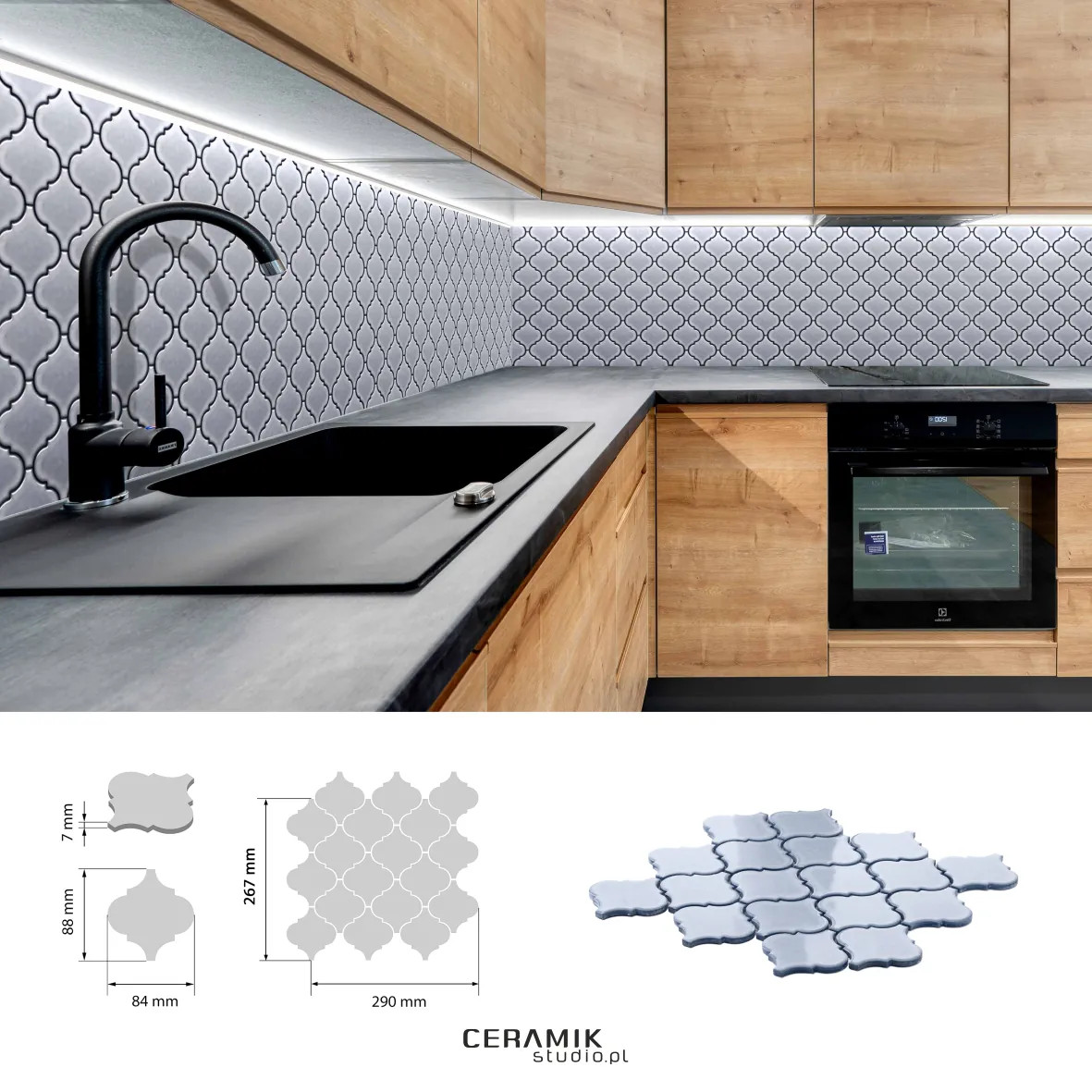 gatunek: Gat.1   Mozaika Arabesque Metalic Blue Charakterystyka produktu Mozaika Arabesque Metalic Blue to ceramiczna płytka w metalicznym odcieniu niebieskiego. Posiada połyskujące wykończenie, które podkreśla geometryczny wzór i nadaje wnętrzu elegancji. Każda kostka ma wymiary około 88 × 84 mm, a plastry mozaiki 267 × 290 mm. Grubość płytki wynosi 7 mm, a produkt należy do pierwszego gatunku. Zastosowanie Mozaika Arabesque Metalic Blue jest przeznaczona na ściany. Idealnie sprawdzi się w łazienkach, kuchniach, kabinach prysznicowych oraz jako dekoracyjny akcent w salonach, holach i strefach dekoracyjnych wnętrz. Dzięki odporności na wilgoć i łatwości w utrzymaniu czystości, jest praktyczna i estetyczna. Zalety i właściwości Połyskujące wykończenie – efektowny wygląd i łatwe czyszczenie. Kostki na elastycznej siatce montażowej – szybki i wygodny montaż. Odporność na wilgoć i temperaturę – idealna do wilgotnych pomieszczeń. Możliwość docinania płytek – elastyczność w aranżacji. Odporność na ogień – klasa A1. Nowoczesny i modny design – połączenie arabeski z metalicznym niebieskim odcieniem nadaje wnętrzu charakteru. Montaż i pielęgnacja Podłoże powinno być równe, suche i oczyszczone. Użyj białego, elastycznego kleju do płytek ceramicznych. Arkusze mozaiki delikatnie dociśnij do podłoża. Zachowaj równą odległość między kostkami przy użyciu krzyżyków dystansowych. Fugowanie można rozpocząć po co najmniej 24 godzinach od montażu. W wilgotnych pomieszczeniach zaleca się stosowanie fug epoksydowych. Połączenia mozaiki z innymi powierzchniami, np. narożniki, zabezpiecz silikonem. Do czyszczenia używaj łagodnych detergentów i miękkiej ściereczki. Estetyka i styl Metaliczny niebieski kolor w połączeniu z geometrycznym wzorem arabeski daje efekt zarówno klasyczny, jak i nowoczesny. Mozaika może być eleganckim akcentem w łazience, kuchni, salonie lub holu, dodając przestrzeni wyjątkowego charakteru i głębi. Podsumowanie Mozaika Arabesque Metalic Blue to połączenie stylu i funkcjonalności: trwała ceramika, elegancki kolor, łatwy montaż i odporność na wilgoć oraz ogień. Idealna do wnętrz, które wymagają eleganckiego i efektownego wykończenia.