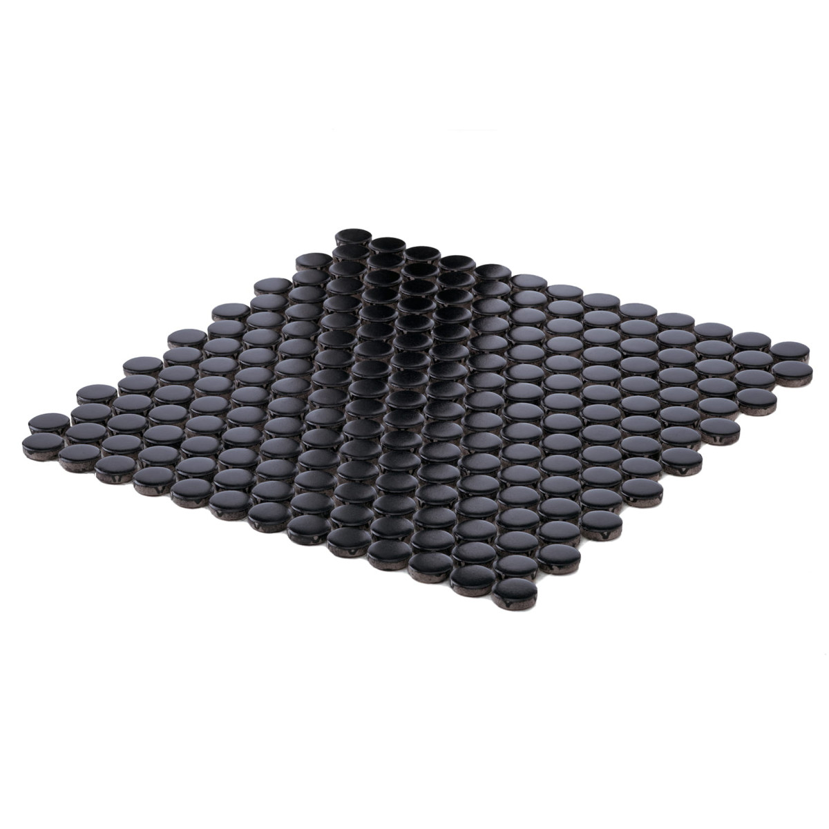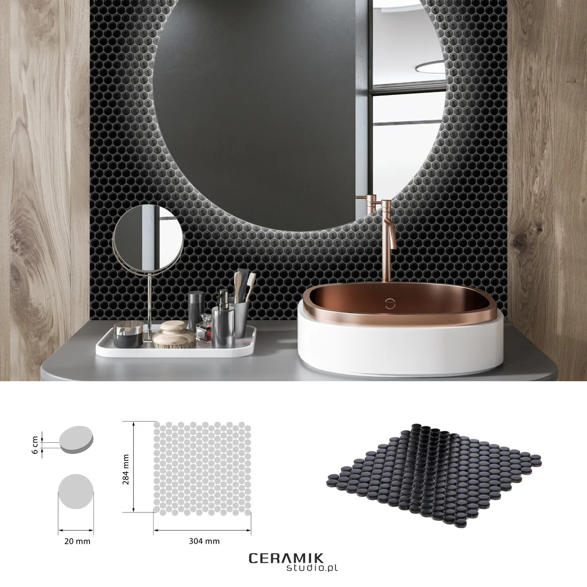 gatunek: Gat.1 Mozaika Dots Black – nowoczesne mozaiki ceramiczne na ścianę Elegancki wzór w czarne kropki Mozaika Dots Black to ceramika ścienna o połyskującym wykończeniu, która wyróżnia się nowoczesnym wzorem okrągłych „kropeķ”. Czarny kolor dodaje wnętrzu charakteru i pozwala stworzyć elega
