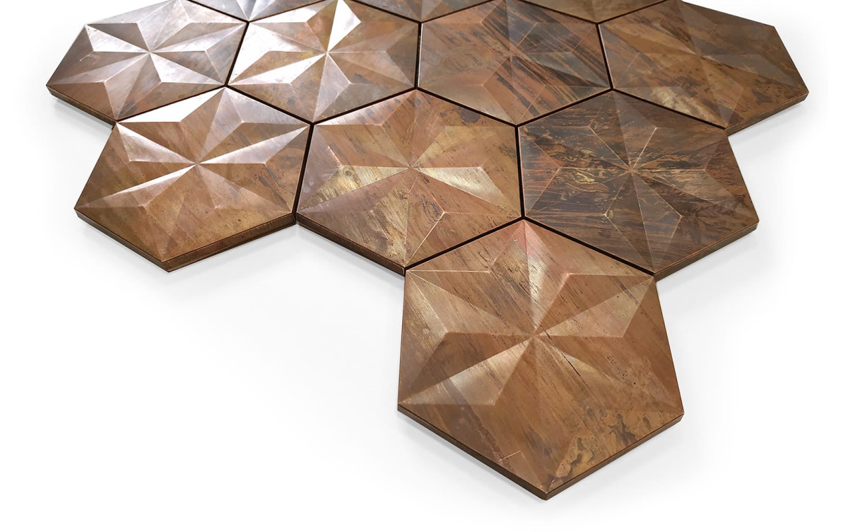 Cena dotyczy 1 plastra. Mozaika Heksagon Cooper Mosaic – opis produktu Charakterystyka ogólna Mozaika Heksagon Cooper Mosaic to dekoracyjna mozaika w kształcie sześciokątów (heksagonów), wykonana z ceramiki i wzbogacona o matową blachę miedzianą. Dzięki temu połączeniu mozaika prezentuje się bardzo efektownie, wprowadzając elegancki, metaliczny akcent, który pasuje do nowoczesnych i luksu