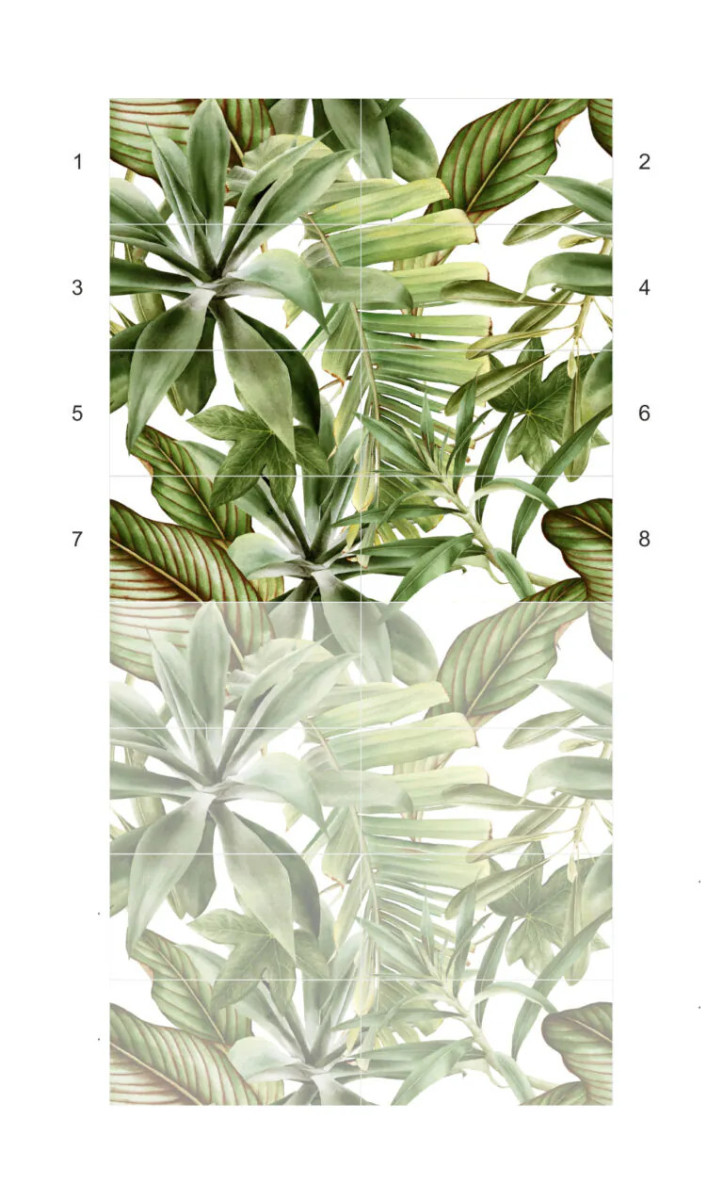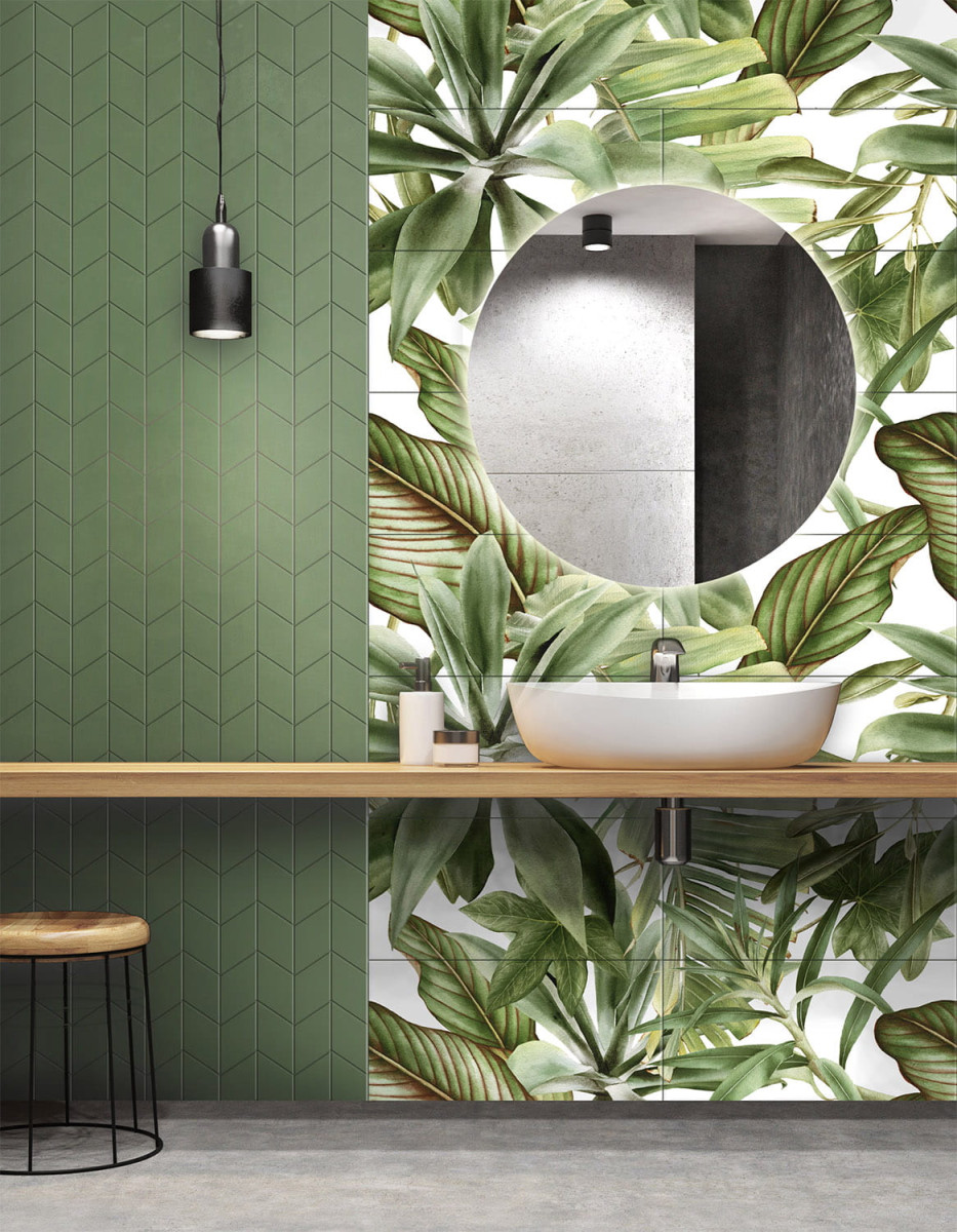 Płytki ceramiczne ścienne rektyfikowane Obraz składa się  z 8  elementów Wymiar pojedynczej płytki 30×60 cm Wymiar obrazu w całości 120×120 cm   Obraz wielkoformatowy Dominikana Green 120×120 cm Egzotyczna zieleń w Twoim wnętrzu Dominikana Green to panel dekoracyjny, który po ułożeniu z 8 płytek 30×60 cm tworzy efektowną ścianę o wymiarach 120×120 cm. Motyw tropikalnych liści wprowadza do wnętrza świeżość, naturalność i przyciągający