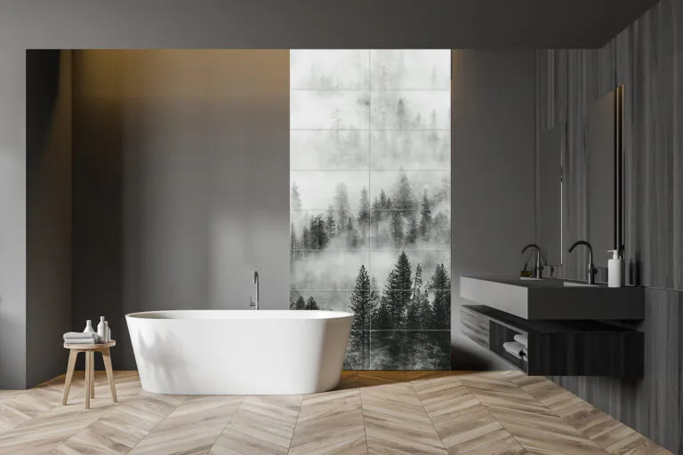 Płytki ceramiczne rektyfikowane Obraz składa się z 16 elementów Wymiar pojedynczej płytki 30×60 cm Wymiar obrazu w całości 240×120 cm Obraz wielkoformatowy Las we Mgle Czarno‑Biały 240×120 cm Subtelny minimalizm i natura w monochromatycznych odcieniach Obraz „Las we Mgle Czarno‑Biały” to dekoracyjny panel ceramiczny, który po ułożeniu tworzy spójną ścianę o wymiarach 240×120 cm. Składa się z 16 płytek o wymiarze 30×60 cm każda. Motyw mglistych drzew w odcieniach czerni, bieli i szarości nadaje wnętrzu elegancki, nowoczesny i spokojny charakter. To idealna propozycja dla osób ceniących minimalizm, naturę i stylową prostotę. Najważniejsze cechy produktu • Duży format — gotowa ściana dekoracyjna Panel składa się z 16 elementów, które po ułożeniu tworzą imponującą powierzchnię dekoracyjną. • Wysokiej jakości ceramika Płytki są rektyfikowane i mają grubość 8 mm. Grafika naniesiona cyfrowo i wypalana w wysokiej temperaturze gwarantuje odporność na zarysowania, detergenty oraz zmiany temperatur i wilgotności. • Odporność na wilgoć Produkt nadaje się do stosowania w łazienkach, kabinach prysznicowych i innych strefach mokrych. • Odporność ogniowa Płytki są niepalne, co pozwala na ich bezpieczne zastosowanie w pobliżu źródeł ciepła, takich jak kominki czy kuchnie. • Łatwy montaż Obraz można montować przy użyciu standardowych klejów do ceramiki. Rektyfikowane brzegi zapewniają równą i estetyczną powierzchnię. • Monochromatyczny, nowoczesny design Motyw lasu we mgle w czerni, bieli i szarości wprowadza do wnętrza atmosferę spokoju i elegancji, pasując do stylów minimalistycznych, industrialnych, skandynawskich i nowoczesnych. Zastosowanie Łazienki i strefy mokre — jako ściana dekoracyjna w kabinie prysznicowej lub nad wanną. Salony i sypialnie — jako główna ściana akcentowa, nadająca wnętrzu charakteru. Korytarze, holle i przedpokoje — efektowna dekoracja przy wejściu lub w przestrzeni reprezentacyjnej. Kuchnie — dekoracyjna ściana nad blatem lub w strefie wizualnej. Przestrzenie komercyjne — biura, gabinety, hotele, lokale usługowe — trwała i elegancka dekoracja. Dlaczego warto wybrać Las we Mgle Czarno‑Biały Obraz „Las we Mgle Czarno‑Biały” łączy estetykę dekoracyjnego panelu ściennego z praktycznością ceramiki. Duży format, odporność na wilgoć i ogień, łatwy montaż oraz nowoczesny, subtelny design sprawiają, że produkt jest trwały, funkcjonalny i efektowny. To idealny wybór dla klientów poszukujących uniwersalnej, eleganckiej i ponadczasowej dekoracji wnętrz, zarówno w domach, jak i przestrzeniach użytkowych.