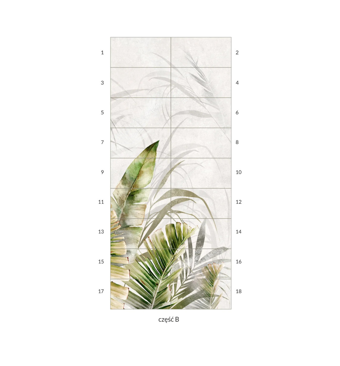 Obraz wielkoformatowy Obraz składa się z 18 elementów Wymiar pojedynczej płytki 30×60 cm Wymiar obrazu w całości 270×120 cm Płytki ceramiczne rektyfikowane Obraz wielkoformatowy Amazonia Beige B 270×120 cm Tropikalny motyw i elegancka dekoracja wnętrz Amazonia Beige B to dekoracyjny panel ceramiczny, który po ułożeniu tworzy spójną powierzchnię ścienną o wymiarach 270×120 cm. Motyw tropikalnych liści na ciepłym, beżowym tle wnosi do wnętrza naturalny charakter, subtelną elegancję i relaksującą atmosferę. Idealna do łazienek, salonów, sypialni, holi oraz przestrzeni użytkowych, którym chcemy nadać unikalny styl i przytulny klimat. Najważniejsze cechy produktu • Duży format – 270×120 cm Panel składa się z 18 płytek o wymiarach 30×60 cm, które po ułożeniu tworzą dekoracyjną powierzchnię ściany, przypominającą obraz lub tapetę, ale z trwałością ceramiki. • Wysokiej jakości ceramika i trwała produkcja Płytki ceramiczne są rektyfikowane, mają grubość 8 mm, co zapewnia stabilny montaż i eleganckie wykończenie. Wzór jest nanoszony cyfrowo i wypalany w wysokiej temperaturze, dzięki czemu obraz zachowuje odporność mechaniczną, chemiczną i termiczną. • Odporność na wilgoć Produkt nadaje się do pomieszczeń mokrych, takich jak łazienki czy strefy prysznicowe, co zwiększa jego funkcjonalność w aranżacjach wnętrz. • Odporność ogniowa Płytki są niepalne i posiadają klasę reakcji na ogień A1, co umożliwia bezpieczne zastosowanie w pobliżu źródeł ciepła. • Łatwy montaż i uniwersalność Obraz montuje się standardowymi klejami do ceramiki. Zalecana fuga wynosi minimum 2 mm. Po ułożeniu tworzy elegancką, spójną powierzchnię, którą można łączyć z innymi płytkami lub elementami dekoracyjnymi. • Subtelny, naturalny motyw tropikalny Beżowe tło z tropikalnym motywem liści nadaje wnętrzu ciepły, naturalny i relaksujący charakter, pasując do stylów boho, earthy, slow design czy modern natural. Zastosowanie Amazonia Beige B Łazienki – także w strefach mokrych; Salony i sypialnie – jako efektowna ściana dekoracyjna; Korytarze, holle, przedpokoje – jako reprezentacyjny panel ścienny; Kuchnie – jako dekoracyjna ściana nad blatem lub przy szafkach; Przestrzenie komercyjne – hotele, biura, restauracje, lokale usługowe. Dlaczego warto wybrać Amazonia Beige B Amazonia Beige B łączy dekoracyjny potencjał obrazu ściennego z funkcjonalnością ceramiki. Duży format, trwałość, odporność na wilgoć i ogień oraz naturalny, elegancki motyw sprawiają, że jest idealnym wyborem dla klientów szukających efektownej, trwałej i praktycznej dekoracji wnętrza.