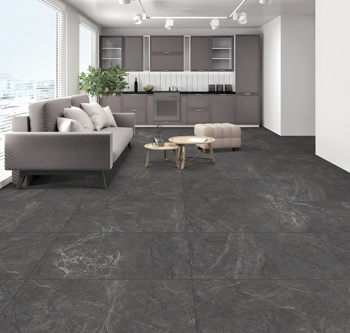 Prime Ceramics Lucca Nero 60×120×7 cm – matowe płytki gresowe z głębokim carvingiem 3D imitujące czarny trawertyn / kamień w antracytowym odcieniu – GAT I