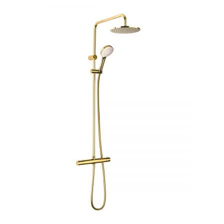 Kolekcja Aby Kolor Złoty Montaż Ścienny Rodzaj Z termostatem W zestawie Bateria z przełącznikiem W zestawie Deszczownica W zestawie Drążek prysznicowy W zestawie Słuchawka prysznicowa W zestawie Wąż prysznicowy