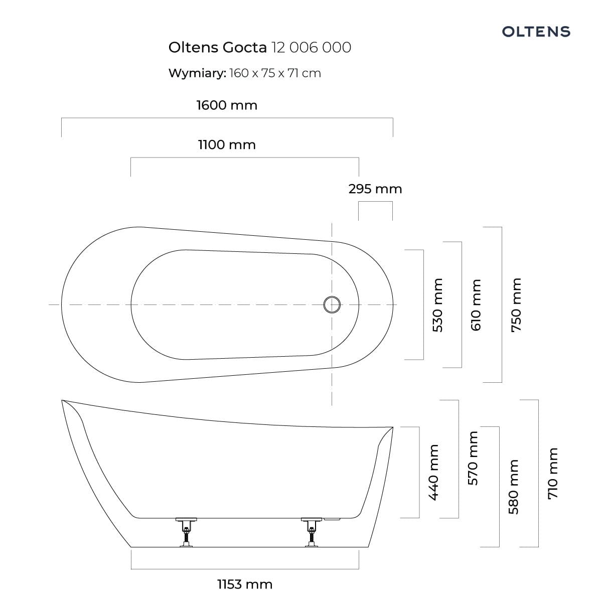 Oltens Gocta wanna wolnostojąca 160×75 cm owalna akrylowa biała 12006000